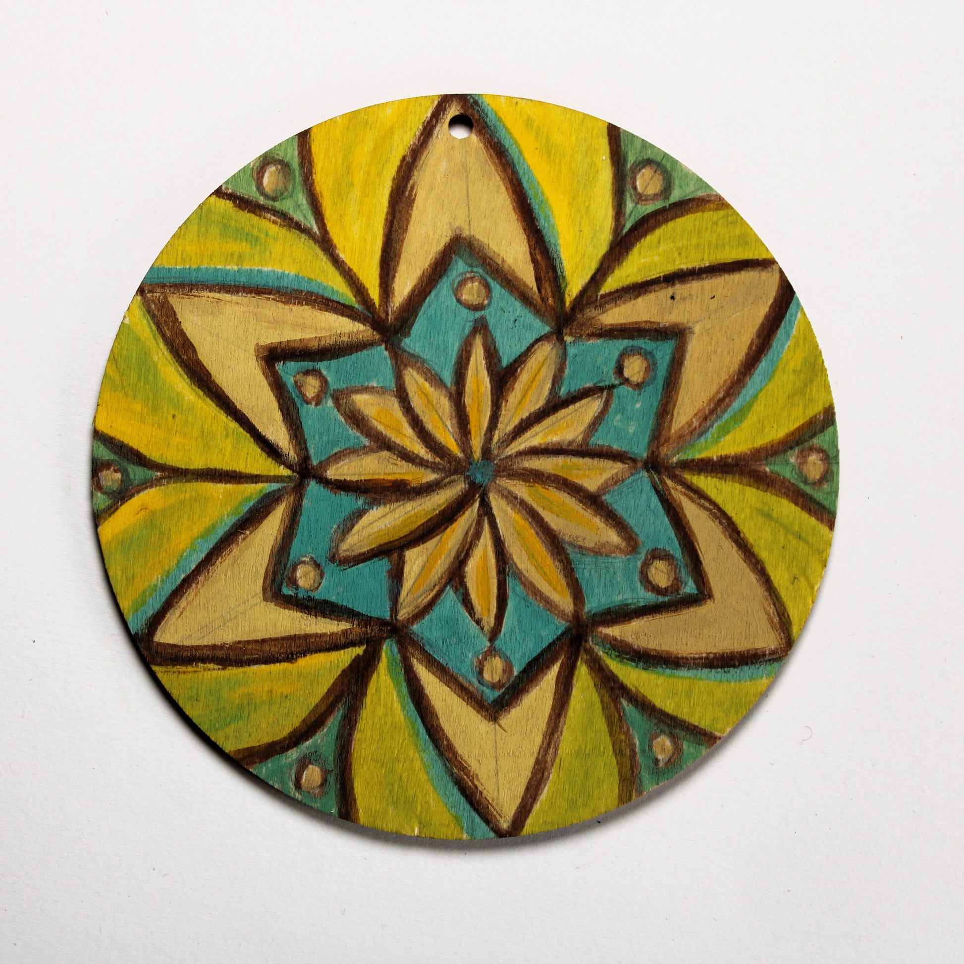 Original hand painted mandala. Acrylic on 4” balsa wood round.